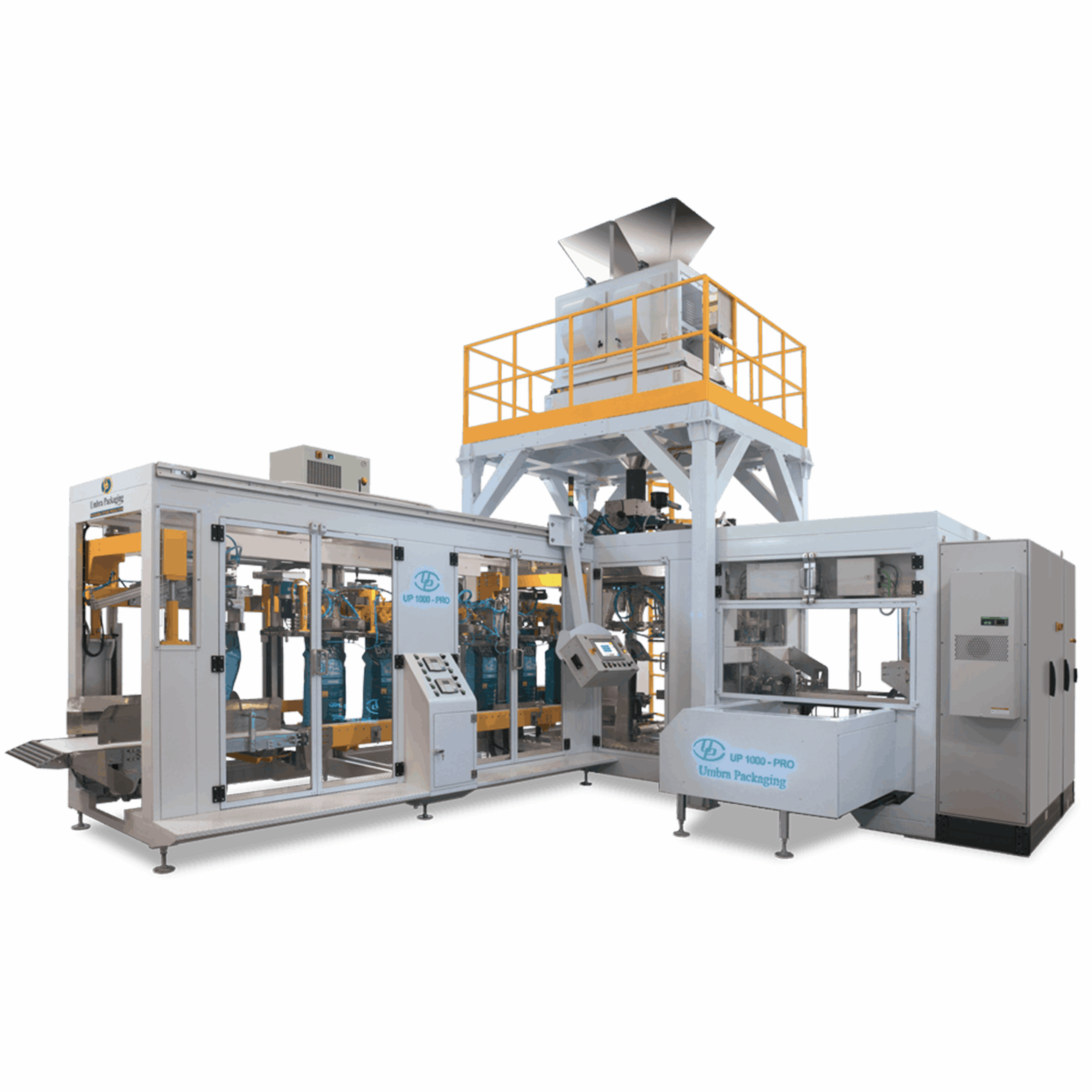 Llena hasta 1000 sacos/hora. Puede procesar bolsas preformadas de papel, plástico, PE; laminado, rafia.