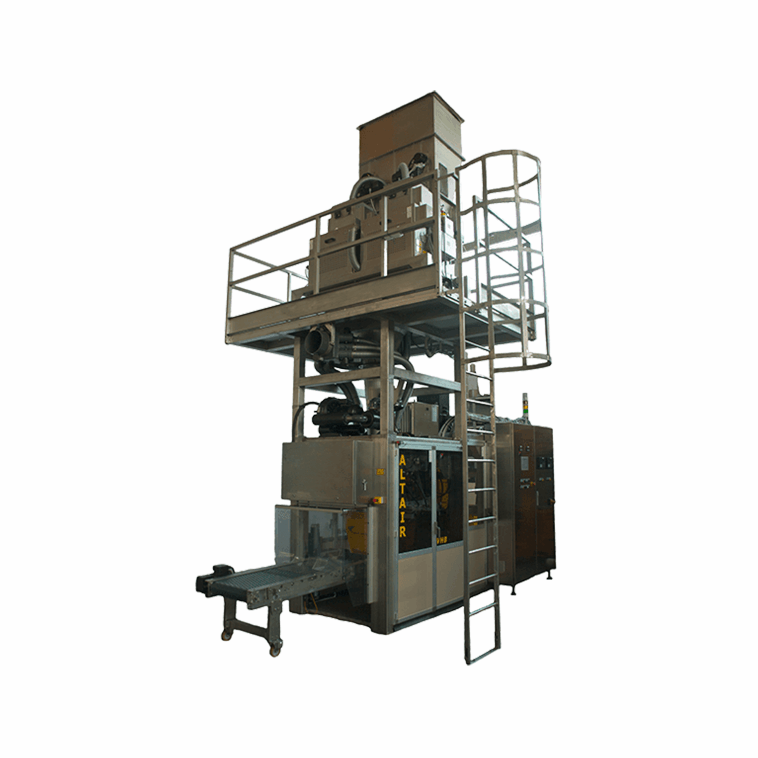 Llena hasta 1500 sacos/hora. Puede procesar bolsas preformadas de papel, plástico, PE; laminado, rafia.