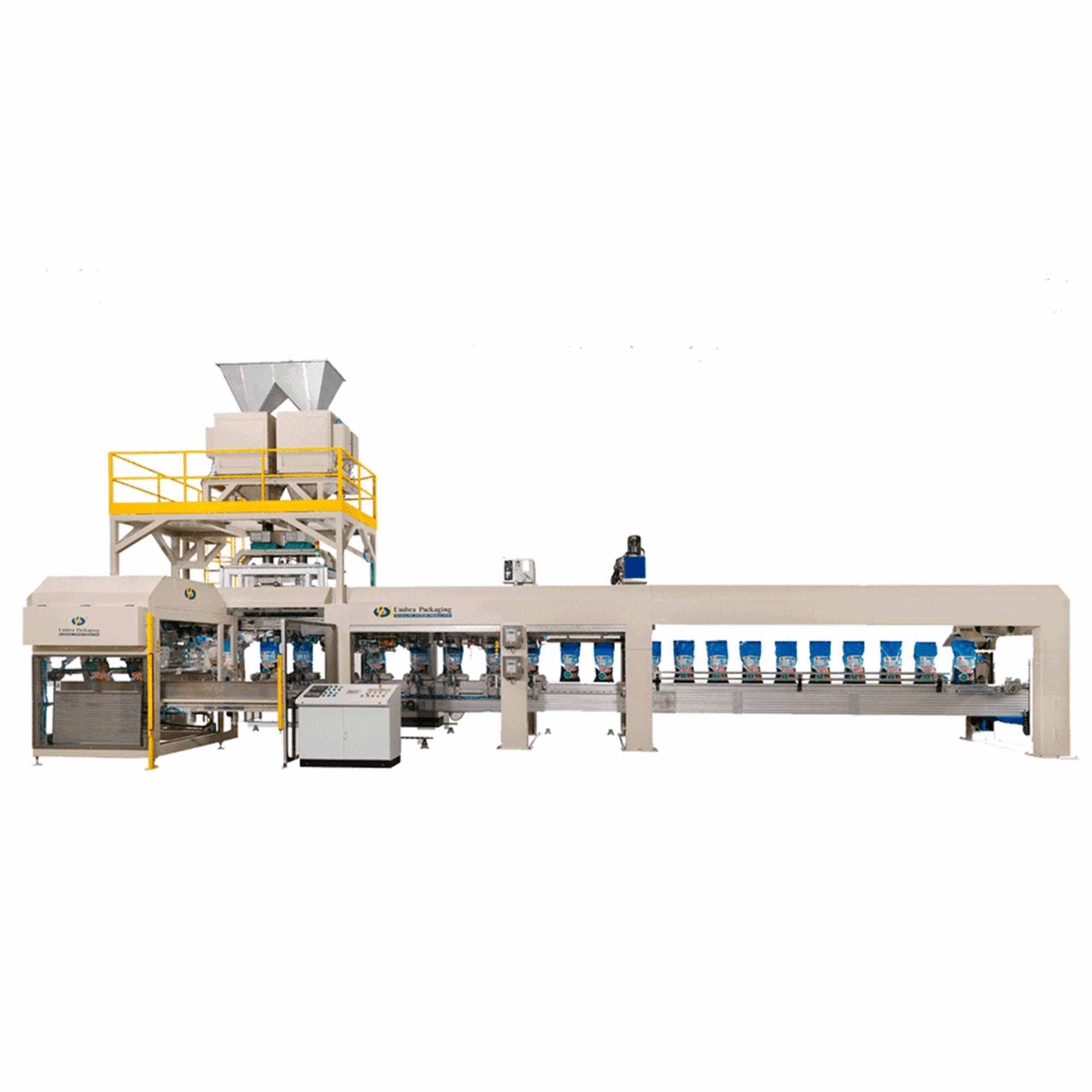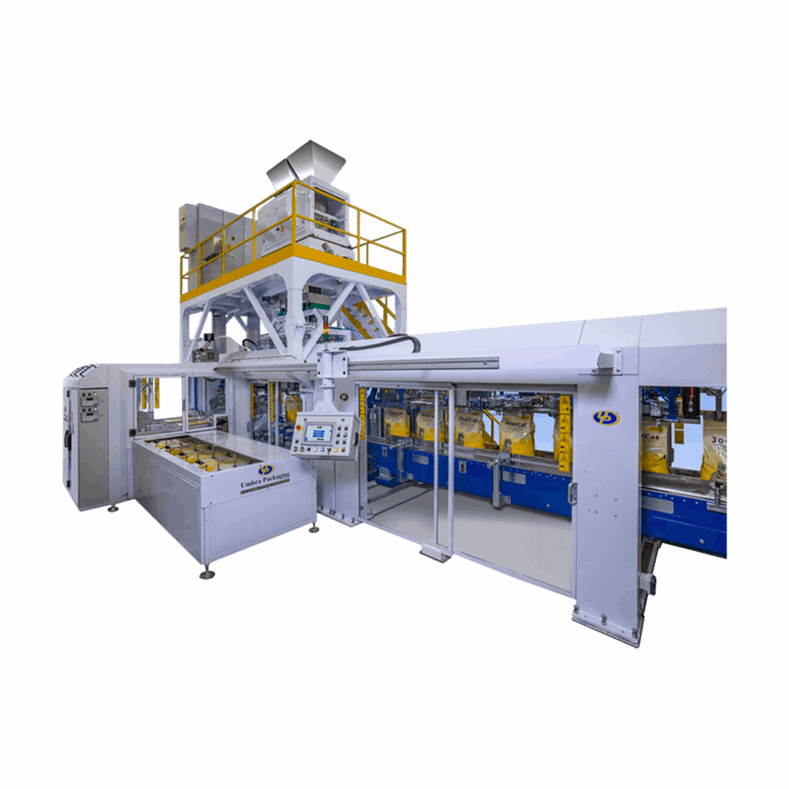 Llena hasta 800 sacos/hora. Puede procesar bolsas preformadas de papel, plástico, PE, laminado, PPW, rafia.